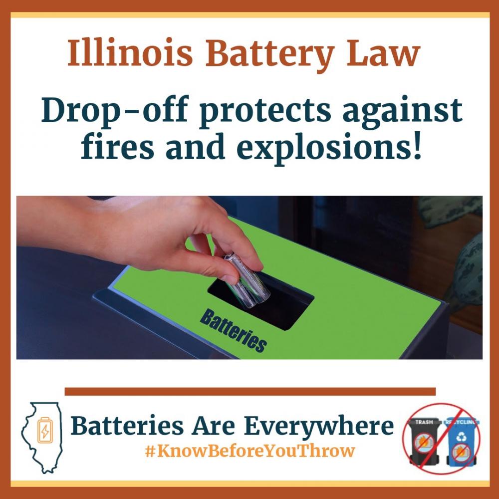 A new Illinois law requires all household batteries to be recycled through special collection programs or drop-offs. The law is intended to prevent fires and explosions caused by lithium batteries, keep hazardous materials out of landfills, and make recycling easy with free, convenient drop-off locations. Click here to learn more.