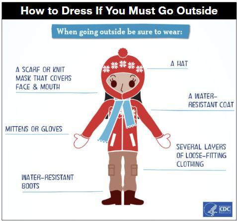 - Limit your time outside. If you need to go outside, then wear layers of warm clothing. Watch for signs of frostbite and hypothermia.